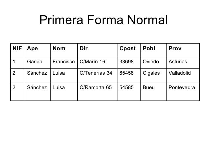Edgar F. Codd originalmente definió las tres primeras formas normales (1NF, 2NF, y 3NF). Estas formas normales se han resumido como requiriendo que todos los atributos no-clave sean dependientes en "la clave, la clave completa, y nada excepto la clave". Las cuarta y quinta formas normales (4NF y 5NF) se ocupan específicamente de la representación de las relaciones muchos a muchos y uno muchos entre los atributos. La sexta forma normal (6NF), en pocas palabras, se basa en el principio de que si se tiene más de dos claves candidatas en una tabla, se tendrán que crear otras tablas con estas.